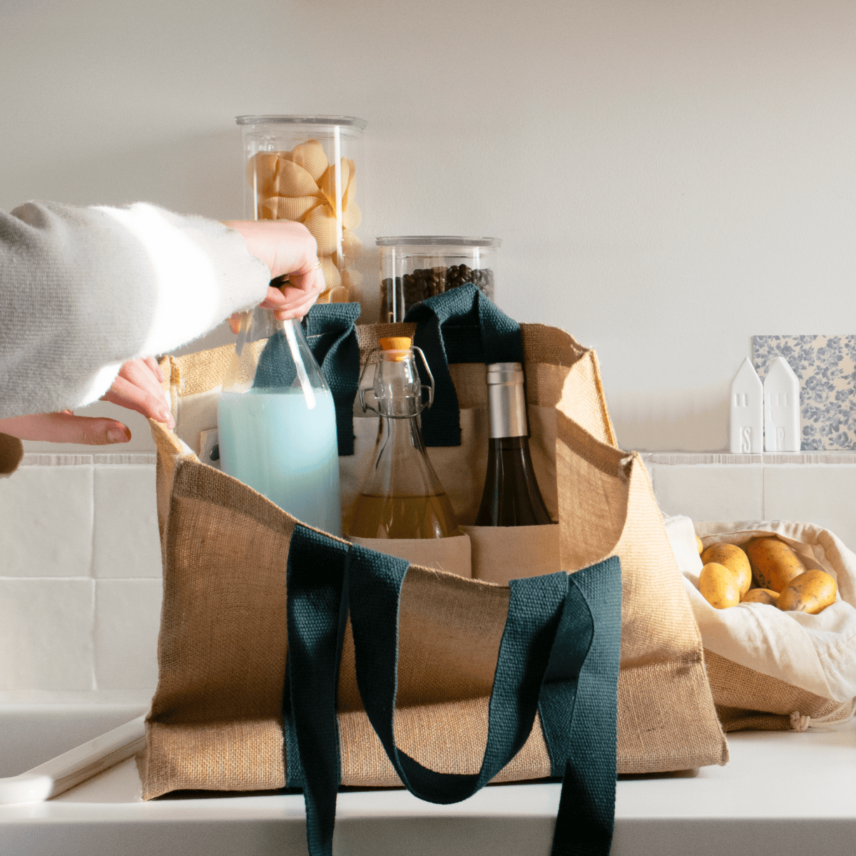 It's perfect for transporting bulk liquids on the way to your local shop or sorting centre. The reinforced cotton handles ensure a firm grip. The bag also fits the Pebbly Shopping Bag.