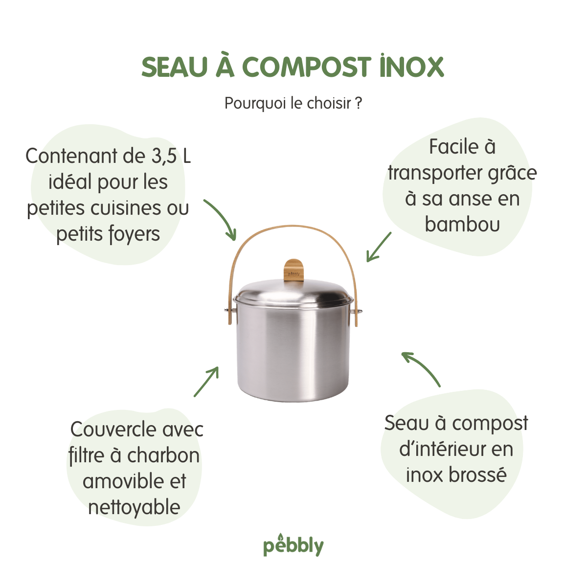 The Pebbly stainless steel compost bin is the perfect solution for households with limited space. Its compact design allows you to collect your organic waste directly in the kitchen without clutter, while maintaining the durability and elegance of stainless steel. Easy to clean and equipped with a lid with a charcoal filter, this bin reduces odors and makes daily composting simple. Optimized for apartments and small kitchens, it’s a practical and stylish accessory for anyone looking to adopt a more eco-friendly lifestyle.
