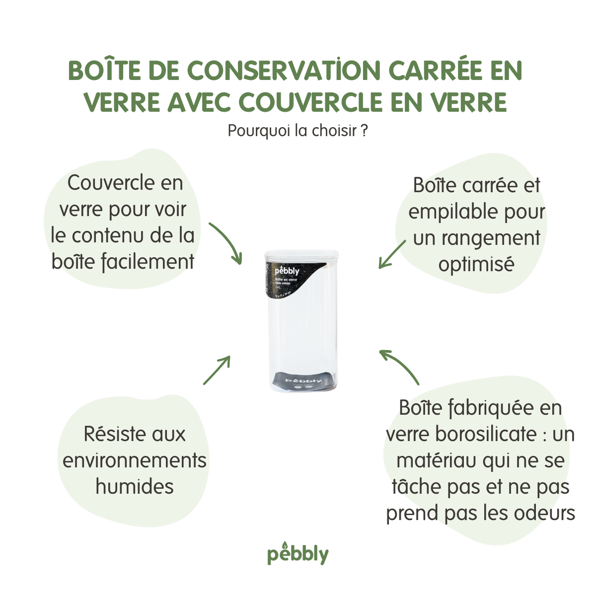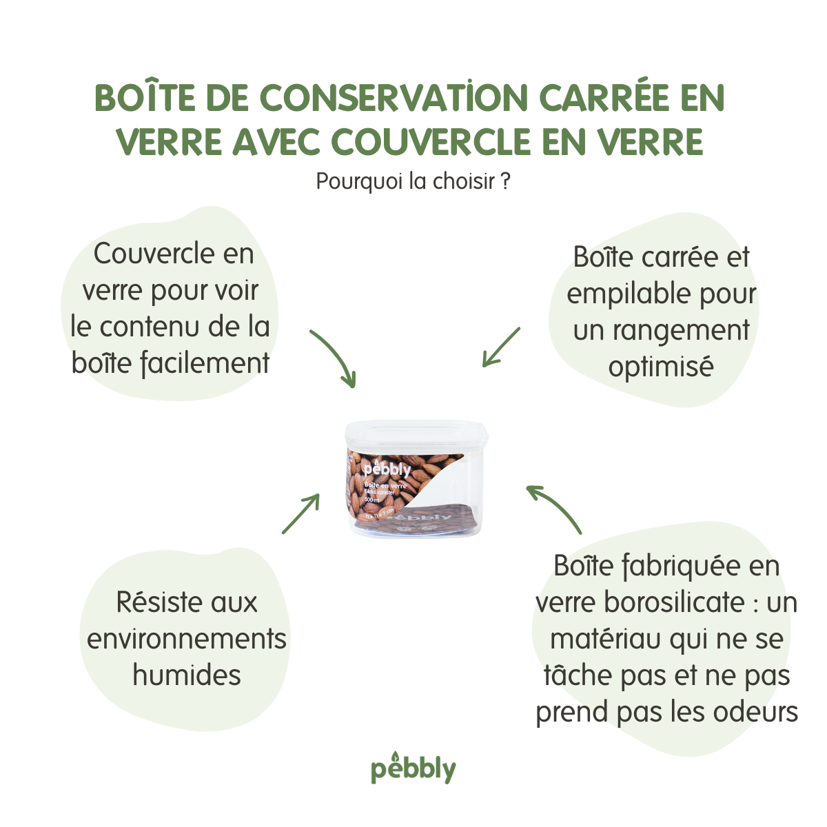 Pebbly glass storage canister offer a host of benefits for keeping your food fresh. Glass guarantees optimal preservation without altering the taste or smell of your ingredients. Its transparency allows you to see the contents instantly, helping you to reduce food waste. These modern, timeless glass tins blend harmoniously into any kitchen, adding a touch of elegance to your kitchen space. Their square shape allows you to optimise storage space by stacking them in your cupboards or on your shelves.