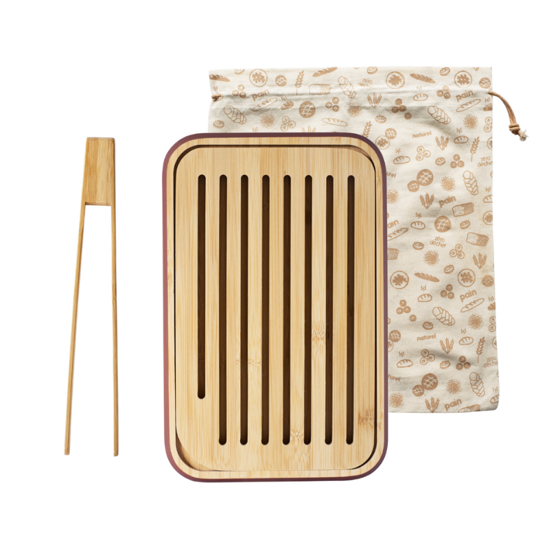• 🥖 Planche à pain avec rebords peints en chocolat et encoche pratique pour récupérer les miettes.