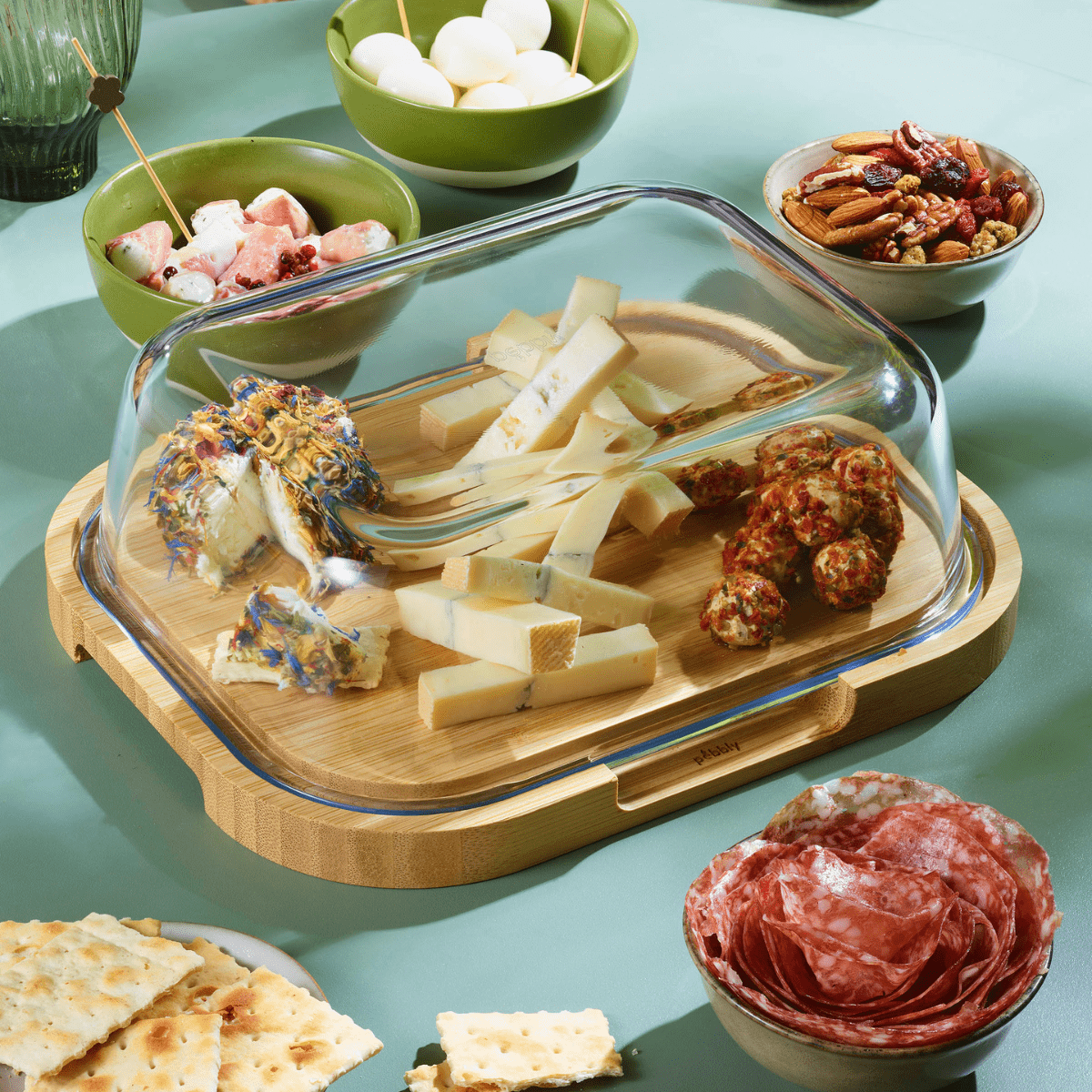 - La boîte à fromage préserve la fraîcheur et les arômes grâce à sa base en bambou naturel et son couvercle en verre. Compacte et élégante, elle passe du réfrigérateur à la table sans effort.